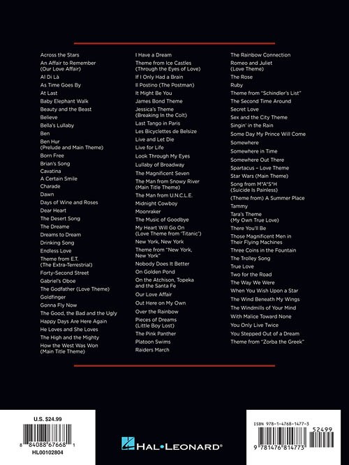 100 beautiful arrangements of standards from the cinema, including: An Affair to Remember (Our Love Affair) • As Time Goes By • Baby Elephant Walk • Beauty and the Beast • Bella's Lullaby • Born Free • Brian's Song • Endless Love • Theme from E.T. (The Extra-Terrestrial) • The Godfather (Love Theme) • Goldfinger • James Bond Theme • Live and Let Die • The Magnificent Seven • My Heart Will Go On (Love Theme from 'Titanic') • Theme from “New York, New York” • Over the Rainbow • The Pink Panther • Raiders March • The Rainbow Connection • The Rose • Singin' in the Rain • Star Wars (Main Theme) • Song from M*A*S*H (Suicide Is Painless) • The Trolley Song • The Way We Were • The Wind Beneath My Wings and more.