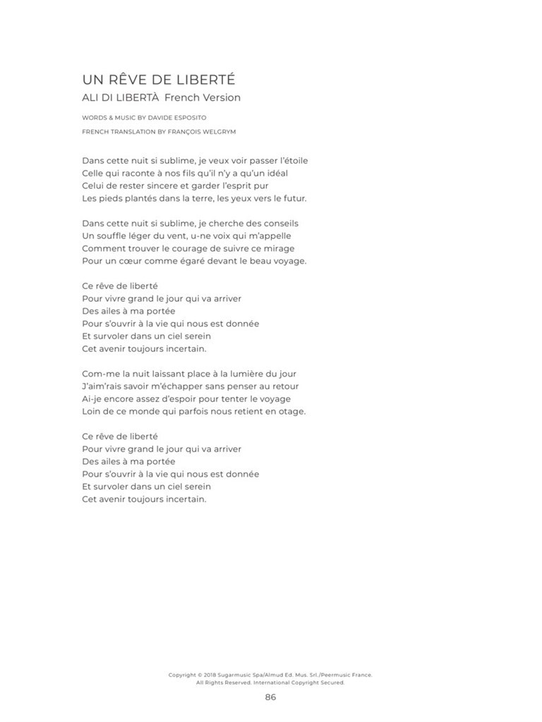 Si is Andrea Bocelli's first album of new material in 14 years, comprising 16 pieces celebrating love, family, faith and hope. Each song is arranged for piano, voice and guitar with chord symbols, chord diagrams and full lyrics. Alternative language lyrics for a selection of the pieces on the album is also presented in the appendix.