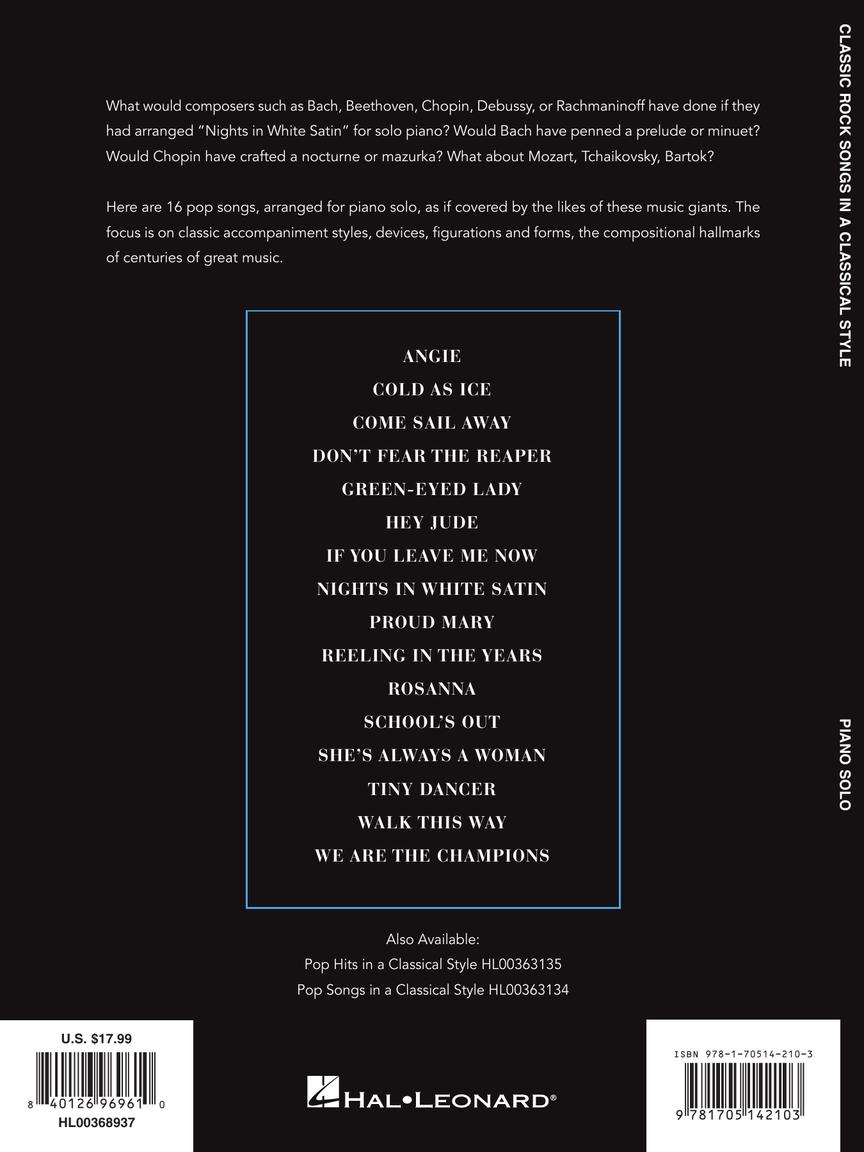 What would composers such as Bach, Beethoven, Chopin, Debussy, or Rachmaninoff have done if they had arranged Nights in White Satin for solo piano? Would Bach have penned a prelude or minuet? Would Chopin have crafted a nocturne or mazurka? What about Mozart, Tchaikovsky or Bartók? Here are 16 classic rock songs arranged for piano solo as if covered by the likes of these music giants. The focus is on classic accompaniment styles, devices, figurations and forms, the compositional hallmarks of centuries of great music.