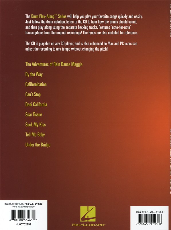 Rock out like Chad Smith to these favourites from the Chili Peppers: The Adventures of Rain Dance Maggie • By the Way • Californication • Can't Stop • Dani California • Scar Tissue • Suck My Kiss • Tell Me Baby • Under the Bridge.