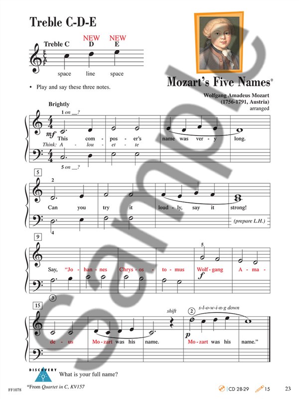 Students play in varied positions, reinforcing reading skills and recognizing intervals through the 5th. Musicianship is built with the introduction of legato and staccato touches. This level continues the interval orientation to reading across the full range of the Grand Staff. The 5-finger approach is presented here in a fresh, musically appealing way.