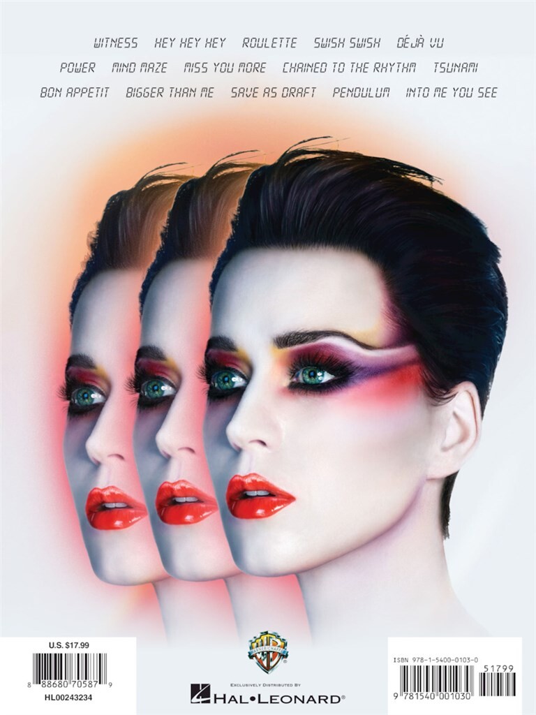 Katy Perry's 2017 album release has reached the top of the Billboard« 200 album charts, led by the single Chained to the Rhythm. Our folio for piano, voice and guitar includes this song and 14 others: Bigger Than Me - Bon Appetit - Deja Vu - Hey Hey Hey - Into Me You See - Mind Maze - Miss You More - Pendulum - Power - Roulette - Save As Draft - Swish Swish - Tsunami - Witness.