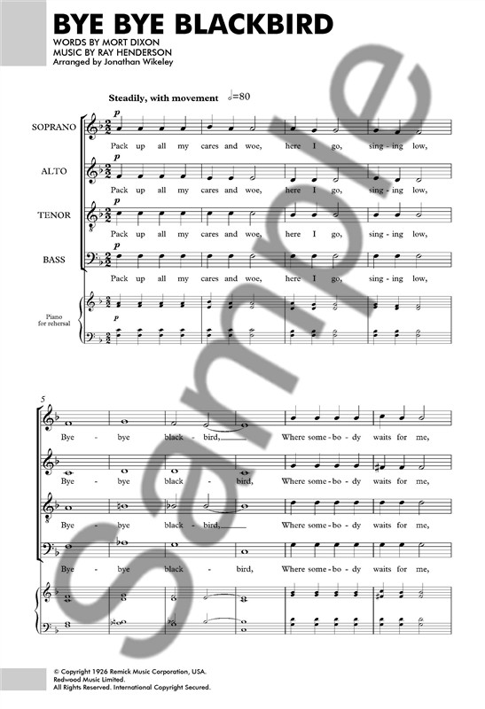 Bye Bye Blackbird is here arranged for SATB choir, a cappella. Piano reduction included for easy rehearsals.