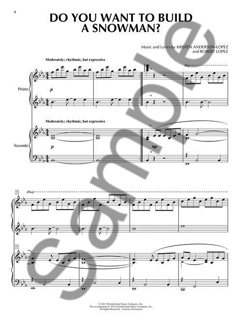 Piano Duet Play-Along Volume 44: Frozen contains 7 hits from the Disney Smash Hit Frozen , composed by Kristen Anderson-Lopez and Robert Lopez and arranged for Piano Duet. Online access to audio for download or streaming is included, offering you separate tracks for the Primo and Secondo parts that are perfect for practice and performance. This collection includes the favorites Do You Want To Build A Snowman?, For The First Time In Forever, Love Is An Open Door, Fixer Upper, Let It Go and more.