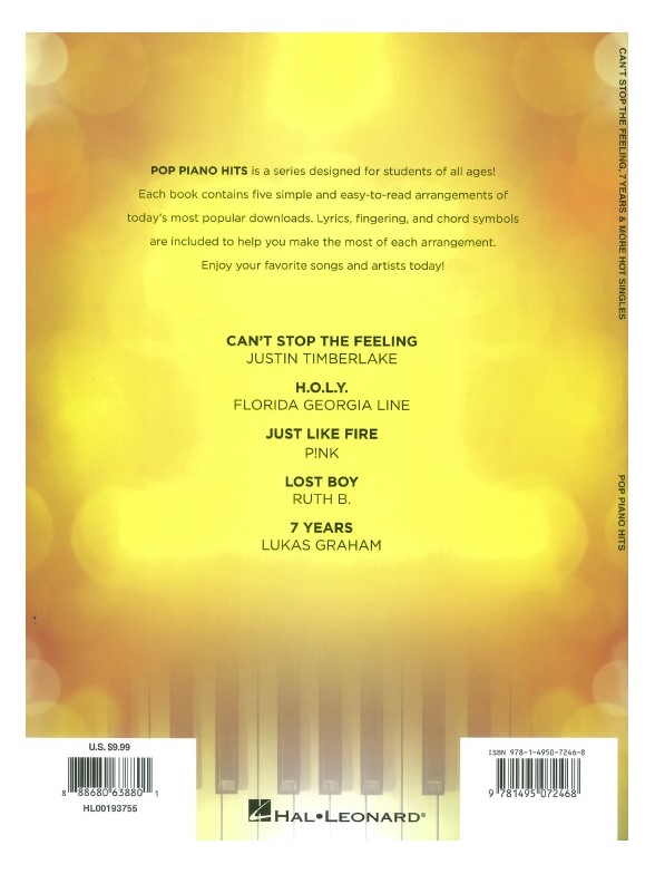 The Pop Piano Hits series has been designed for students of all ages! Each book contains five simple and easy-to-read arrangements of some of today's most popular downloads. Lyrics, fingering and chord symbols are included to help you make the most of each arrangement. Enjoy your favourite songs and artists today! This edition contains the songs: Can't Stop the Feeling (Justin Timberlake), H.O.L.Y. (Florida Georgia Line), Just Like Fire (P!nk), Lost Boy (Ruth B.) and 7 Years (Lukas Graham).