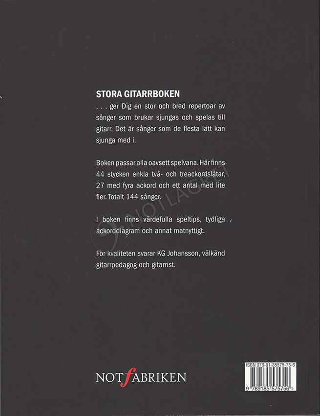 En stor och bred repertoar av sånger som brukar sjungas och spelas till gitarr. Det är sånger som de flesta lätt kan sjunga med i. Boken passar alla, oavsett spelvana. Här finns 44 stycken enkla två- och treackordslåtar. 27 med fyra ackord och ett antal med lite fler. Totalt 144 sånger. I boken finns värdefulla speltips, tydliga ackordsdiagram och annat matnyttigt.
